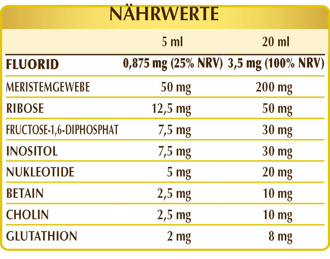 Bidestilliertes pflanzliches Glycerin, reines Wasser; glycerinmazerat aus frischen meristematischen Geweben: weiß-Tanne (Abies pectinata, Synonym Abies alba) Knospen, Bergkiefer (Pinus montana, Synonym Pinus mugo oder Pinus pumilio) Knospen, Jungfernrebe (Ampelopsis veitchii, Synonym Parthenocissus tricuspidata) junge Triebe; Ribose, Fructose-1,6-diphosphat; Säureregulator: Zitronensäure; Inositol, Betaincitrat, Tarincholin; Nukleotidmischung: AMP (Adenosinmonophosphat), CMP (Cytosinmonophosphat), GMP (Guanosinmonophosphat), UMP (Uridinmonophosphat); Glutathion, Kupfergluconat; Süßstoffe natürlicher Herkunft: Thaumatin (E957). Mit natürlichen Süßungsmitteln.