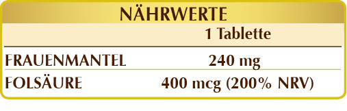 Nahrungsergänzungsmittel auf Grundlage von Folsäure und Frauenmantel. Für Frauen im gebärfähigen Alter ist eine zusätzliche Folsäurezufuhr im Vorgriff auf eine Schwangerschaft nützlich, um den Status von mütterlichem Folsäure zu erhöhen, das, wenn es niedrig ist, ein Risikofaktor für die Entwicklung von Neuralrohrdefekten beim Fötus ist *; es trägt auch zum Wachstum des mütterlichen Gewebes bei. Im Allgemeinen greift Folsäure in den Zellteilungsprozess ein, stärkt das Immunsystem, reduziert Müdigkeit und Erschöpfung und erhält die normale psychologische Funktion. Des Weiteren greift sie in die Synthese der Aminosäuren, in den Homocystein-Metabolismus und in die Hämatopoese, die Bildung und Reifung aller Zellen des Blutes, ein.