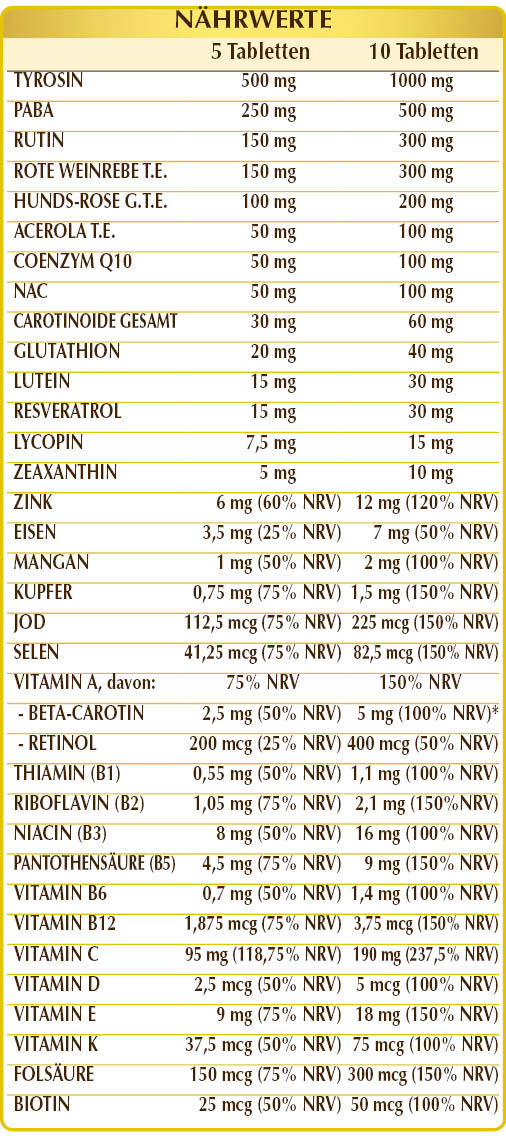 (L-)Tyrosin (aus Fermentation), mikrokristalline Cellulose°, Gummi Arabicum°, PABA (p-Aminobenzoesäure), Ringelblume (Tagetes erecta) Blütenköpfe T.E. (standardisiert auf 10% Lutein), pflanzliche Routine, roter Weinrebe (Vitis vinifera) Kerne T.E. (standardisiert auf 95% oligomere Proanthocyanidine), Hunds-Rose (Rosa canina) Früchte G.T.E. (standardisiert auf 70% Vitamin C), Tomate (Solanum lycopersicum) Früchte T.E. (standardisiert auf 10% Lycopin), Acerola (Malpighia glabra) Früchte T.E. (standardisiert auf 50% Vitamin C), Coenzym Q10, NAC (N-Acetylcystein), Ringelblume (Tagetes erecta) Blütenköpfe T.E. (standardisiert auf 10% Zeaxanthin), Zinkgluconat, Siliciumdioxid°°, Eisengluconat, Dunaliella (Dunaliella salina) Thallus (Alge) T.E. (standardisiert auf 10% Beta-Carotin), reduziertes Glutathion, Vitamin E natürlicher Herkunft (D-α-Tocopherylacetat), Resveratrol pflanzlichen Ursprungs, Magnesiumstearat Pflanzlichen Ursprungs°°, Mangangluconat, Vitamin B3 (Niacin), Kupfergluconat, Vitamin B5 (Calciumpantothenat), aktiviertes Vitamin B2 (Natrium-Riboflavin-5-phosphat), Vitamin A (Retinylacetat), aktiviertes Vitamin B6 (Pyridoxal-5-phosphat), Flechte (Cladonia rangiferina) Thallus T.E. (standardisiert in Vitamin D3 Cholecalciferol 100.000 IE/g), Vitamin B1 (Thiaminhydrochlorid), aktivierte Folsäure (Calcium-L-Methylfolat), Kaliumiodid, Natriumselenit, Vitamin K1 (Phyllochinon), Biotin, aktiviertes Vitamin B12 (5-Desoxyadenosylcobalamin, Methylcobalamin). °Füllstoff °°Trennmittel