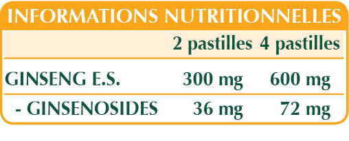 Ginseng (Panax ginseng) Wurzeln und Blätter T.E. (standardisiert auf 12% Ginsenosiden ), mikrokristalline Cellulose°, Gummi Arabicum°, Maltodextrine aus Mais oder Reis, Siliciumdioxid°°, Magnesiumstearat°°.