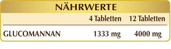 Mögliche positive Effekte, gemäß den angegebenen Anwendungsmodalitäten, bei der Einnahme von: *Mindestens 3 g Glucomannan pro Tag in drei Portionen von jeweils 1 g im Rahmen einer hypokalorischen Diät. **4 g Glucomannan pro Tag.