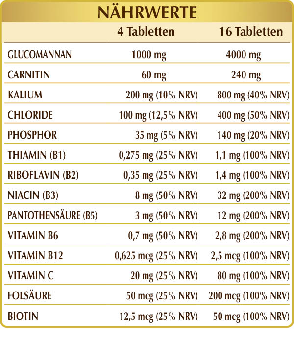 Glucomannan (Amorphophallus konjac)-Wurzelpulver (titriert mit 90 % in Ballaststoffen titriert), mikrokristalline Cellulose°, Gummi arabicum°, Kaliumchlorid, dibasisches Kaliumphosphat, (L-)Carnitin, Siliciumdioxid°°, Vitamin C (Ascorbinsäure), Magnesiumstearat pflanzlichen Ursprungs°°, Vitamin B3 (Nicotinamid), Vitamin B5 (Calciumpantothenat), aktiviertes Vitamin B6 (Pyridoxal-5-phosphat), aktiviertes Vitamin B2 (Natriumriboflavin-5-phosphat), Vitamin B1 (Thiaminhydrochlorid), aktivierte Folsäure (Calcium L -Methylfolat), Biotin, aktiviertes Vitamin B12 (5-Desoxyadenosylcobalamin, Methylcobalamin). °Füllstoff °°Trennmittel