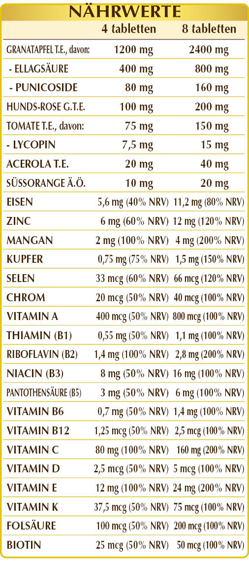 Nahrungsergänzungsmittel auf Grundlage von Früchten des Granatapfels, Mineralstoffen, Vitaminen und anderen Nährstoffen. Granatapfel, Tomate, Hagebutte und Acerola besitzen vorteilhafte antioxidative Eigenschaften, die zusammen mit Zink, Mangan, Kupfer, Selen und Vitamin B2, C und E dazu beitragen, die Zellenvor oxidativem Stress zu schützen.