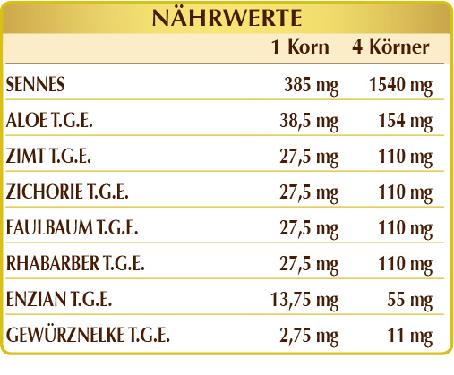 Sennes (Cassia angustifolia) Blätter, Aloe (Aloe vera) Lymphe oder Saft der Blätter T.G.E., Zimt (Cinnamomum zeylanicum) Rinde T.G.E., Zichorie (Cichorium intybus) Wurzeln T.G.E., Faulbaum (Rhamnus frangula) Rinde T.G.E., Chinesischer Rhabarber (Rheum palmatum) Rhizome T.G.E., Enzian (Gentiana lutea) Wurzeln T.G.E., Gewürznelke (Eugenia caryophyllata) Blütenknospen T.G.E.