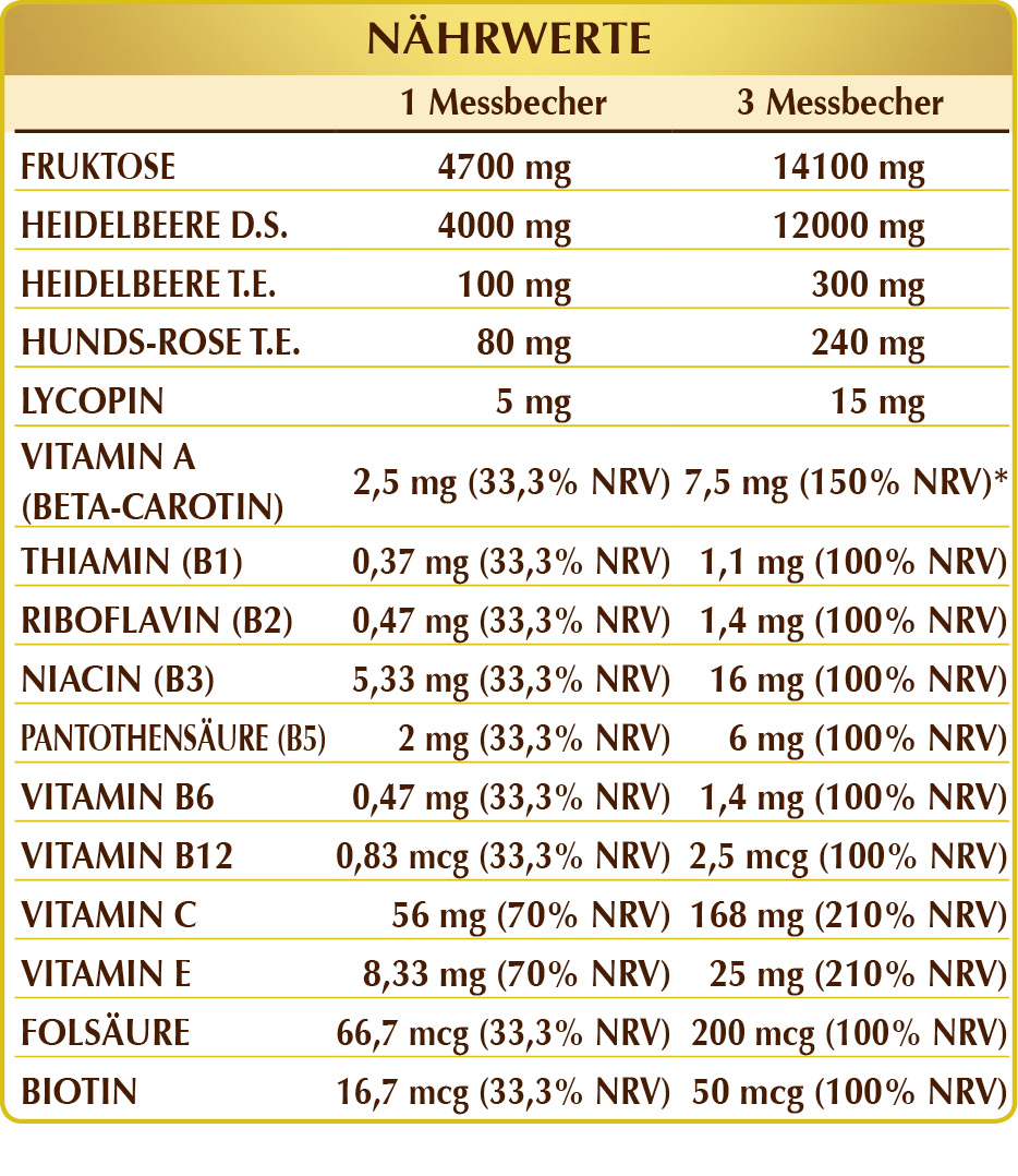 Fructose, Heidelbeere (Vaccinium myrtillus) Früchte D.S., Maltodextrine aus Mais oder Reis, Heidelbeere (Vaccinium myrtillus) Früchte T.E. (standardisiert auf 25% Anthocyanoside), Hunds-Rose (Rosa canina) Früchte G.T.E. (standardisiert auf 70% Vitamin C), Tomate (Solanum lycopersicum) Früchte T.E. (titriert mit 10% Lycopin, Beta-Carotin (standardisiert auf 10 %), Vitamin E (DL-α-Tocopherylacetat), Vitamin B3 (Nicotinamid), Vitamin B5 (Calciumpantothenat), aktiviertes Vitamin B2 (Natrium-Riboflavin-5-phosphat), aktiviertes Vitamin B6 (Pyridoxal-5-phosphat), Vitamin B1 (Thiaminhydrochlorid), aktivierte Folsäure (L-Methylfolat-Calcium), Biotin, aktiviertes Vitamin B12 (5-Deoxyadenosylcobalamin, Methylcobalamin).