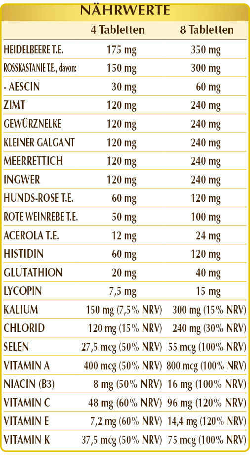 Kaliumchlorid, mikrokristalline Cellulose°, Gummi Arabicum°, Heidelbeere (Vaccinium myrtillus) Früchte T.E. (titriert mit 25% Anthocyanoside), Rosskastanie (Aesculus hippocastanum) Rinde T.E. (titriert mit 20% Aescin), Zimt (Cinnamomum zeylanicum) Rinde Pulv., Gewürznelke (Eugenia caryophyllata) Blütenknospen Pulv., Kleiner Galgant (Alpinia officinarum) Rhizome Pulv., Meerrettich (Armoracia rusticana) Wurzeln Pulv., Ingwer (Zingiber officinalis) Rhizome Pulv., Tomate (Solanum lycopersicum) Früchte T.E. (titriert mit 10% Lycopin), (L-)Histidin, Hunds-Rose (Rosa canina) Früchte G.T.E. (titriert mit 70% Vitamin C), Rote Weinrebe (Vitis vinifera) Kerne T.E. (titriert mit 95% Oligomeren Proanthocyanidinen), Kaliumcitrat, Siliciumdioxid°°, reduziertes Glutathion, Vitamin E natürlicher Herkunft (D-α-Tocopherylacetat),Kaliumgluconat, Acerola (Malpighia glabra) Früchte T.E. (titriert mit 50% Vitamin C), Magnesiumstearat pflanzlichen Ursprungs°°, Vitamin B3 (Niacin), Vitamin A (Retinylacetat), Vitamin K1 (Phyllochinon), Natriumselenit. Pulv. = Pulver °Füllstoff °°Trennmittel