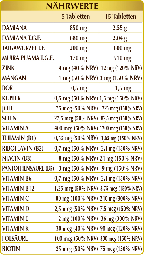 Nahrungsergänzungsmittel auf Grundlage von Kräutern, Mineralstoffen und Vitaminen. Damiana und Muira Puama wirken körperlicher und geistiger Müdigkeit entgegen und besitzen, zusammen mit Taigawurzel, eine positive tonische Wirkung. Selen fördert die Spermatogenese, während Zink dazu beiträgt, den normalen Testosteronspiegel im Blut aufrechtzuerhalten und eine normale Fruchtbarkeit und Fortpflanzung zu unterstützen*.