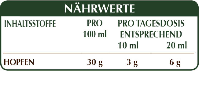 Alkoholfreie Flüssig Gesamt-Extrakt, gewonnen aus: bidestilliertes pflanzliches Glycerin, reinem Wasser, Hopfen (Humulus lupulus) Zapfen (weibliche Blüten).