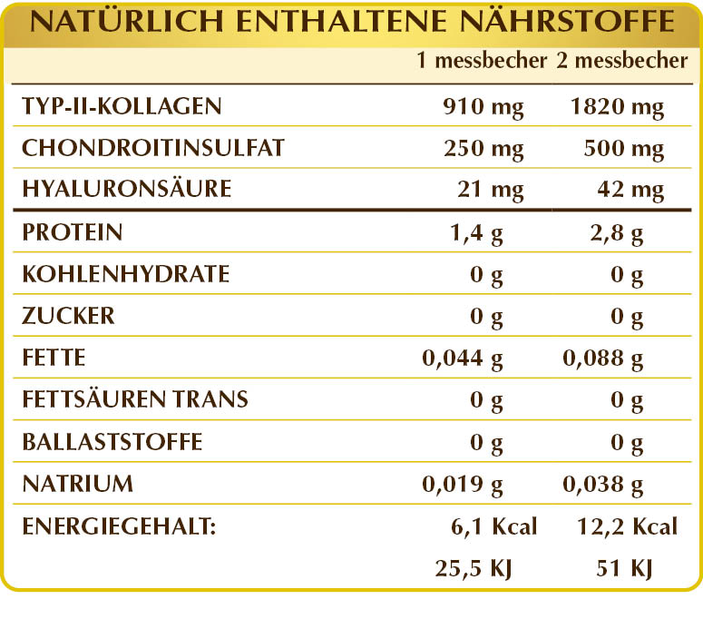 Typ-II-Kollagen aus hydrolysiertem Hühnerknorpelpulver (52%), Maltodextrin aus Mais oder Reis.