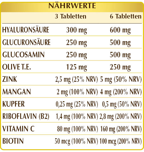 N-Acetyl-D-Glucosamin (aus Krebstieren), Natriumhyaluronat (niedermolekular), Natriumglucuronat, mikrokristalline Cellulose, Gummi arabicum, Olivenblätter (Olea europaea) T.E. (standardisiert auf 20 % Hydroxytyrosol), Vitamin C (Ascorbinsäure), Zinkgluconat, Mangangluconat, Siliciumdioxid, aktives Vitamin B2 (Riboflavin-5-Phosphat-Natrium), Kupfergluconat, pflanzliches Magnesiumstearat, Biotin. °Füllstoff °°Trennmittel