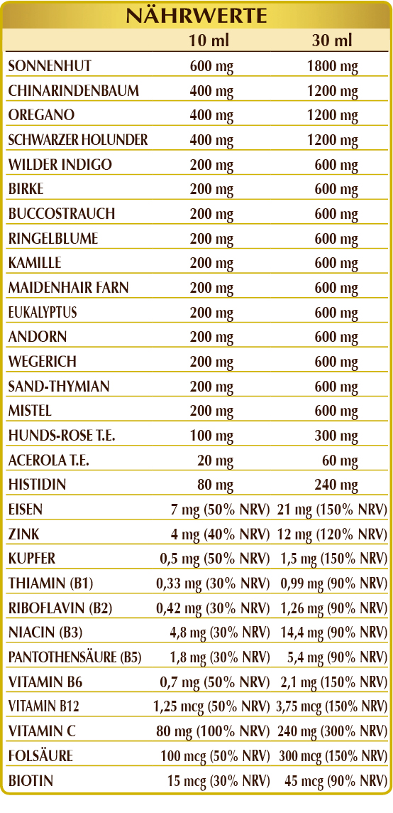 Bidestilliertes pflanzliches Glycerin, reines Wasser, Sonnenhut (Echinacea angustifolia, purpurea und pallida) Wurzeln F.G.E., Chinarindenbaum (Cinchona calisaya) Rinde F.G.E., Oregano (Origanum vulgare) Blüten F.G.E., schwarzer Holunder (Sambucus nigra) Blüten F.G.E., wildem Indigo (Baptisia tinctoria) Wurzeln F.G.E., Birke (Betula alba oder pubescens) Blüten F.G.E., Buccostrauch (Barosma betulina) Blüten F.G.E., Ringelblume (Calendula officinalis) Blütenköpfe (Blüten) F.G.E., echte Kamille (Matricaria chamomilla) Blütenköpfe F.G.E., maidenhair Farn (Adiantum capillus-veneris) Kraut F.G.E., Eukalyptus (Eucalyptus globulus) Blüten F.G.E., Andorn (Marrubium vulgare) Kraut mit Blüten F.G.E., Wegerich (Plantago lanceolata) Blätter F.G.E., Sand-Thymian (Thymus serpyllum) Blätter F.G.E., Mistel (Viscum album) Blätter und Zweige F.G.E., Hunds-Rose (Rosa canina) Früchte F.G.E. (standardisiert auf 70 % Vitamin C), (L)-Histidin, Eisengluconat, Zinkgluconat, Acerola (Malpighia glabra), Früchte T.E. (standardisiert auf 50 % Vitamin C), natürlichen Ursprung Süßstoffe: Steviolglykoside aus Stevia, Thaumatin; Vitamin B3 (Nicotinamid), Kupfersulfat, Vitamin B5 (Calciumpantothenat), aktiviertes Vitamin B6 (Pyridoxal-5-phosphat), Vitamin B1 (Thiaminhydrochlorid), aktiviertes Vitamin B2 (Riboflavin-5-Natriumphosphat), aktivierte Folsäure (Calcium). L-Methylfolat), Biotin, aktiviertes Vitamin B12 (5-Desoxyadenosylcobalamin, Methicobalamin).