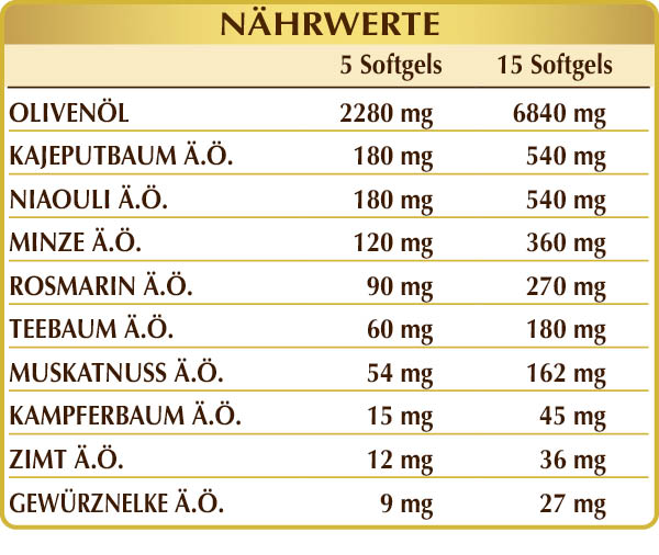 Olivenöl Extravergine aus entsteinten Oliven*, Kajeputbaum (Melaleuca leucadendron var. cajaputi) Blätter Ä.Ö., Niaouli (Melaleuca leucadendron var. viridiflora) Blätter Ä.Ö., Pfefferminze (Mentha piperita) Blätter Ä.Ö., Rosmarin (Rosmarinus officinalis) Blätter Ä.Ö., Teebaum (Melaleuca alternifolia) Spitzen Ä.Ö., Muskatnuss (Myristica fragrans) Samen Ä.Ö., Kampferbaum (Cinnamomum camphora) Rinde Ä.Ö., Zimt (Cinnamomum zeylanicum) Rinde Ä.Ö., Gewürznelke (Eugenia caryophyllata) Blütenknospen Ä.Ö.; Hilfsstoffe (Softgels): Speisegelatine und Glycerin.