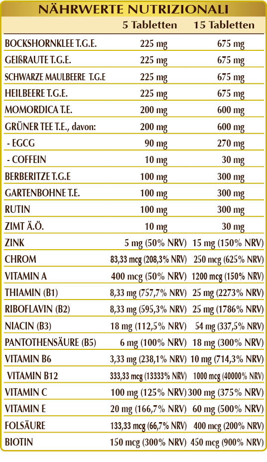 Bockshornklee (Trigonella foenum-graecum) Samen T.G.E., Geißraute (Galega officinalis) Kraut mit Blüten T.G.E., Schwarze Maulbeere (Morus nigra) Blätter T.G.E., Heidelbeere (Vaccinium myrtillus) Blätter T.G.E., Momordica oder Bittermelone (Momordica charantia) Früchte T.E. (standardisiert auf 10% Charantin), Grüner Tee (Camellia sinensis) Blätter T.E. (standardisiert auf 98 % Polyphenolen, davon 45 % Epigallocatechingallat oder EGCG), mikrokristalline Cellulose°, Gummi Arabicum°, Berberitze (Berberis vulgaris) Wurzelrinde T.G.E., Gartenbohne (Phaseolus vulgaris) Samen T.E., Rutin, Vitamin C (Ascorbinsäure), Siliciumdioxid°°, Vitamin E pflanzlichen Ursprungs (D-α-Tocopherylacetat), Zinkgluconat, Magnesiumstearat pflanzlichen Ursprungs°°, Vitamin B3 (Nicotinamid), aktiviertes Vitamin B2 (Riboflavin-5-Phosphat-Natrium), Vitamin B1 (Thiaminhydrochlorid), Zimt (Cinnamomum zeylanicum) Rinde Ä.Ö., Vitamin B5 (Calciumpantothenat), aktiviertes Vitamin B6 (Pyridoxal-5-phosphat), Vitamin A (Retinylacetat), Chrompicolinat, aktiviertes Vitamin B12 (5-Desoxyadenosylcobalamin, Methylcobalamin), Biotin, Folsäure. °Füllstoff °°Trennmittel