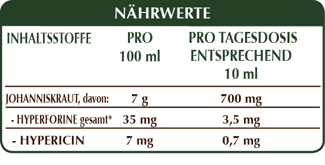 Alkoholfreie Flüssig Gesamt-Extrakt, gewonnen aus: bidestilliertes pflanzliches Glycerin, reinem Wasser, Johanniskraut (Hypericum perforatum) Kraut mit Blüten.