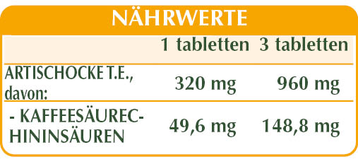 Artischocke(Cynara Scolymus) Blätter T.E. (standardisiert auf 15,5% Kaffeesäurechininsäuren, ausgedrückt als Chlorogensäure), mikrokristalline Cellulose, Arabisches Gummi, Siliciumdioxid, pflanzliches Magnesiumstearat.°° °Füllstoff °°Trennmittel