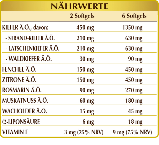Strand-Kiefer (Pinus pinaster) Nadeln und Knospen Ä.Ö., Latschenkiefer oder Legföhre (Pinus montana) Nadeln und Knospen Ä.Ö., Rote Weinrebe (Vitis vinifera) Samenöl, Fenchel (Foeniculum vulgare) Früchte Ä.Ö., Zitrone (Citrus limonum) Fruchtschalen Ä.Ö., Rosmarin (Rosmarinus officinalis) Blätter Ä.Ö., Muskatnuss (Myristica fragrans) Samen und Samenmantel (Macis) Ä.Ö., Waldkiefer (Pinus sylvestris) Nadeln und Knospen Ä.Ö., Wacholder (Juniperus communis) Früchte Ä.Ö., α-Liponsäure, Vitamin E (DL-α-Tocopherylacetat); Hilfsstoffe (Softgel): Speisegelatine und Glycerin.