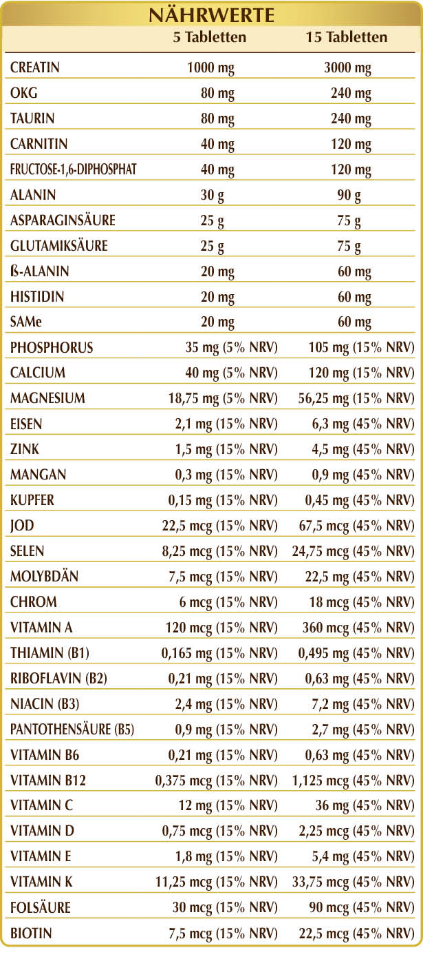Creatinmonohydrat, mikrokristalline Cellulose°, Gummi Arabicum, Dicalciumphosphat, Taurin, (L-)Ornithin-α-Ketoglutarat (OKG), Kreatinphosphat, Acetyl (L-)Carnitinhydrochlorid, Siliciumdioxid°°, Glycerophosphat-Calcium, Fructose 1,6-Diphosphat, SAMe (S-Adenosylmethionin-Tosylat), (L-)Alanin, Glycerophosphat-Magnesium, Magnesiumoxid, Aspartat (L-)Säure, Glutamat (L-)Säure, ß-Alanin, (L-)Histidin, Eisen Gluconat, Kaliumascorbat, Magnesiumstearat pflanzlichen Ursprungs,°° Zinkgluconat, Pflanzliche Vitamin E (D-α-Tocopherylacetat), Vitamin B3 (Inosit-Hexanicotinat), Mangan Gluconat, Kupfer Gluconat, Vitamin B5 (Calcium-D-Pantothenat), Vitamin A (Retinylacetat), Aktiviertes Vitamin B2 (Riboflavin-5-Phosphat-Natrium), Aktiviertes Vitamin B6 (Pyridoxal-5-Phosphat), Flechte (Cladonia rangiferina) Thallus T.E. (standardisiert auf Vitamin D3 Cholecalciferol 100.000 IE/g), Vitamin B1 (Thiaminhydrochlorid), aktiviertes Folsäure (Calcium-L-Methylfolat), Chrompicolinat, Natriumselenit, Vitamin K1 (Phyllochinon), Biotin, aktiviertes Vitamin B12 (5-Deoxyadenosylcobalamin, Methylcobalamin). T.E.= Trockenextrakt °Füllstoff °°Trennmittel