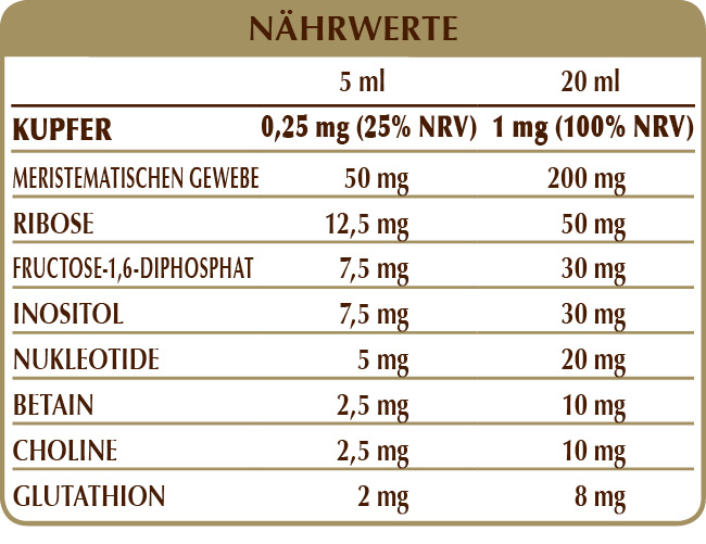 Bidestilliertes Pflanzliches Glycerin, reines Wasser; Frische Meristemgewebe: Wacholder (Juniperus communis) junge Triebe, Esche (Fraxinus excelsior) Knospen, Hundsrose (Rosa canina) junge Triebe, Schwarpappel (Prunus spinosa) Knospen; Ribose, Fructose-1,6-bisphosphat; Acidität Korrektor: Citronensäure; Inositol, Betain Citrat, Cholin Tartrat; Mischung von Nukleotiden: AMP (Adenosinmonophosphat), CMP (Cytosinmonophosphat), GMP (Guanosinmonophosphat), UMP (Uridinmonophosphat); Glutathion, Kupfergluconat; Süßstoffe natürlicher Herkunft: Thaumatin (E957). Mit natürlichen Süßungsmitteln.