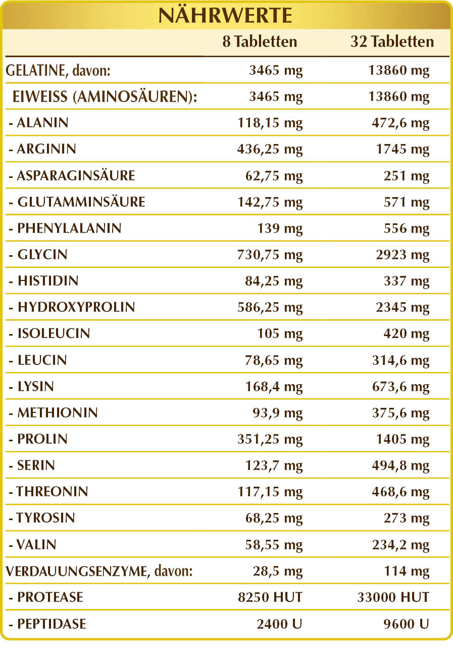 Speisegelatine (aus Rinderhaut), Reisstärke, mikrokristalline Cellulose°, Guarkergummi°, Siliziumdioxid°°, Protease (500.000 HUT/g) pflanzlichen Ursprungs (Aspergillus oryzae), Peptidase (200.000 U/g), Magnesiumstearat pflanzlichen Ursprungs°°.° Füllstoff. °°Trennmittel.