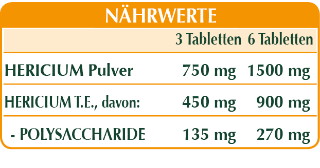 Hericium (Hericium erinaceus) Sporophor (Pilz) Pulver, hericium (Hericium erinaceus) Sporophor (Pilz) T.E. (standardisiert auf 30% Polysaccharide), mikrokristalline Cellulose°, Gummi Arabicum°, Siliciumdioxid°°, Magnesiumstearat pflanzlichen Ursprungs°°.