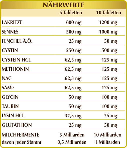°Lakritze (Glycyrrhiza glabra) Wurzeln, Sennes (Cassia angustifolia) Blätter, Mikrokristalline Cellulose°, Gummi Arabicum° (L-)Cystin, (L-)Cystein HCL oder Hydrochlorid, (L-)Methionin, NAC (N-Acetylcystein), SAMe (S-adenosil Methionin), Glycin, Taurin, (L-)Lysin HCL oder Hydrochlorid, Fenchel (Foeniculum vulgare) Samen Ä.Ö., Glutathion, Siliciumdioxid°°, Lebende Milchfermente-Mischung (titriert mit 10% Jedem der Folgenden Stämme ATCC: Bifidobacterium bifidum SD5215, Bifidobacterium breve SD5206, Bifidobacterium lactis SD5219; Lactobacillus acidophilus SD5212, Lactobacillus brevis SD5214, Lactobacillus bulgaricus SD5589, Lactobacillus casei SD5213, Lactobacillus paracasei SD5275, Lactobacillus plantarum SD5209, Lactobacillus rhamnosus SD5217) , Magnesiumstearat pflanzlichen Ursprungs°°.