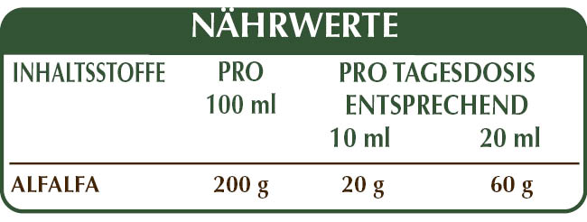 Alkoholfreie Flüssig Gesamt-Extrakt, gewonnen aus: bidestilliertes pflanzliches Glycerin, reinem Wasser, Alfalfa oder Luzerne (Medicago sativa) Kraut mit Blüten.