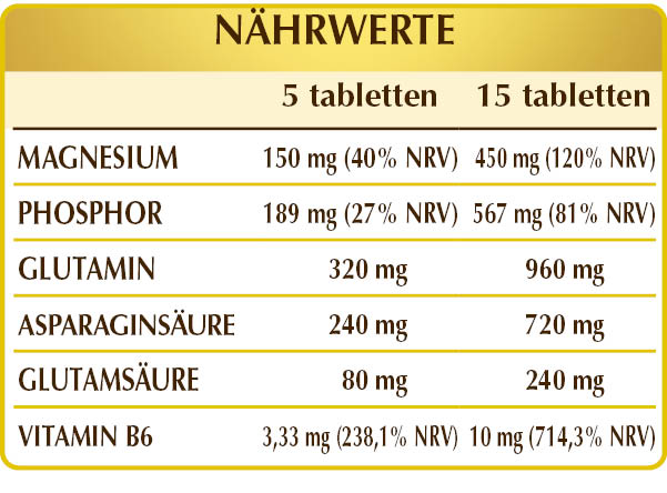 Nahrungsergänzungsmittel auf Grundlage von Magnesium und Aminosäuren. Es greift in die Prozesse der Zellteilung ein und kann das Elektrolytgleichgewicht, die Eiweißsynthese und die normale Muskelfunktion fördern. Mit Vitamin B6 trägt es zur Funktion des Nervensystems bei, unterstützt normale psychische Funktionen, fördert den Energiestoffwechsel und hilft gegen Müdigkeit und Erschöpfung. Des Weiteren erhält es, zusammen mit Phosphor, das Wohlbefinden der Knochen und Zähne aufrecht.