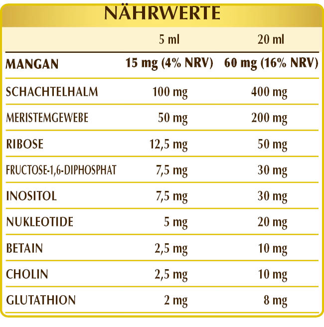 Bidestilliertes pflanzliches Glycerin, reines Wasser, Magnesiumcitrat; Frisches Meristemgewebe: Weißdorn (Crataegus oxyacantha, oder Crataegus monogyna) junge Triebe, himbeere (Rubus idaeus) junge Triebe, roter Hartriegel (Cornus sanguinea) Knospen, Schlehdorn (Prunus spinosa) Knospen; Magnesiumgluconat, Magnesiumpidolat, Ribose, Fructose-1,6-diphosphat, Inositol, Betaincitrat, Cholintartrat; Nukleotid-Mischung: AMP (Adenosinmonophosphat), CMP (Cytosinmonophosphat), GMP (Guanosinmonophosphat), UMP (Uridinmonophosphat); Glutathion, Süßstoffe natürlicher Herkunft: Thaumatin. Mit natürlichen Süßungsmitteln.