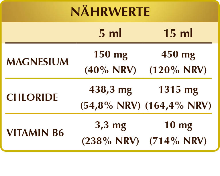Wasser, Glycerin, Magnesiumchlorid-Hexahydrat; Süßstoffe natürlichen Ursprungs: Erythrit, Steviolglykoside aus Stevia, Thaumatin; aktiviertes Vitamin B6 (Pyridoxal-5-phosphat).