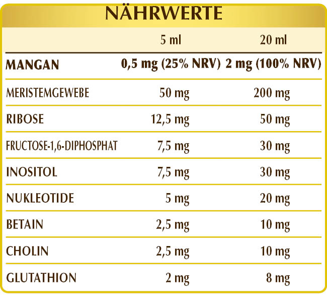 Bidestilliertes pflanzliches Glycerin, reines Wasser; Glycerinischer Macerat frischer Meristemgewebe: Schwarze Johannisbeere (Ribes nigrum) Knospen, Rotbuche (Fagus sylvatica) Knospen, Birke(Betula alba, Synonyme Betula pubescens, Betula verrucosa oder Betula pendula) Knospen , Himbeere (Rubus idaeus) junge Triebe; Ribose, Fruktose 1,6-diphosphat; Säurerungsmittel: Zitronensäure; Inositol, Betaincitrat, Cholintartrat; Nukleotid-Mischung: AMP (Adenosinmonophosphat), CMP (Cytosinmonophosphat), GMP (Guanosinmonophosphat), UMP (Uridinmonophosphat); Mangangluconat; Glutathion, Kupfergluconat; Süßstoffe natürlicher Herkunft: Thaumatin. Mit natürlichen Süßungsmitteln.