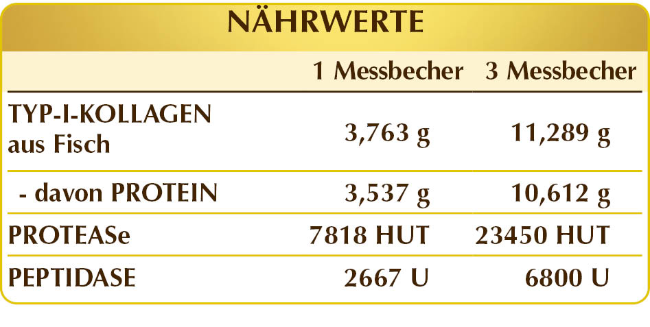 Typ I Kollagen aus hydrolysierter Fischgelatine in Granulatform, pflanzliche Verdauungsenzyme (aus Aspergillus spp): Protease (500.000 HUT/g) und Peptidase (200.000 U/g).