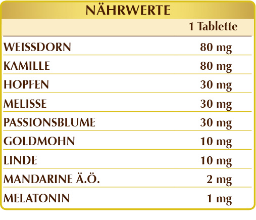 Weißdorn (Crataegus oxyacantha) Blüten und Blätter Pulv, Echte Kamille (Matricaria chamomilla) Blütenköpfe (Blüten) Pulv, mikrokristalline Cellulose°, Gummi Arabicum°, Hopfen (Humulus lupulus) Zapfen (weibliche Blüten) Pulv, Melisse (Melissa officinalis) Blätter Pulv, Passionsblume (Passiflora incarnata) Kraut mit Blüten Pulv, Siliciumdioxid°°, Goldmohn (Eschscholtzia californica) Kraut Pulv, Linde (Tilia platyphyllos) Blüten Pulv, Mandarine (Citrus reticulata) Fruchtschalen Ä.Ö., Melatonin, Magnesiumstearat pflanzlichen Ursprungs°°.