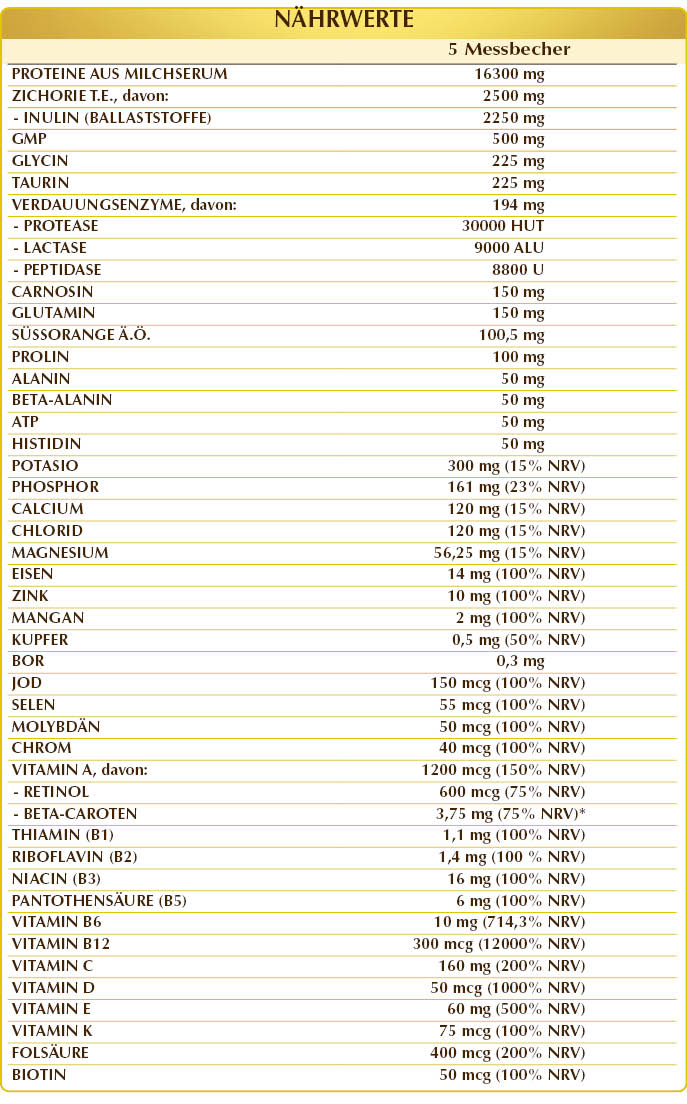 Kalziumkaseinat, Proteine aus Milchserum, Zichorie (Cichorium intybus) Wurzeln T.E. (standardisiert auf 90 % Inulin), Calciumglycerophosphat, Glutamin-Peptid, Magnesiumglycerophosphat, Kaliumcitrat, Kaliumchlorid, Glycin, Taurin, Vitamin C (Ascorbinsäure), (L-)Carnosin, (L-)Glutamin, Vitamin E (DL-α-Tocopherylacetat), Eisen-Gluconat, (L-)Prolin; natürliches Aroma: süße Orange (Citrus aurantium var. sinensis oder dulcis) Fruchtschalen-Öl; Laktase (100.000 ALU/g), Zink-Gluconat, ATP (Adenosintriphosphat-Natriumsalz), (L-)Alanine, Beta-Alanin, (L-)Histidin, Protease (500.000 HUT/g), Peptidase (200.000 U/g), Dunaliella (Dunaliella salina) Thallus (Alge) T.E. (titriert mit 10 % in Beta-Carotin), Vitamin D3 (Colecalciferol 100.000 IE/g), Mangan-Gluconat, Vitamin B3 (Niacinamid), aktiviertes Vitamin B6 (Pyridoxal-5-Phosphat); natürliche Süßungsmittel: Steviolglycoside aus Stevia und Thaumatin; Vitamin B5 (Calciumpantothenat), Vitamin A (Retinylacetat), Kupfer-Gluconat, Natriumborat, aktiviertes Vitamin B2 (Riboflavin-5-Phosphat-Natrium), Vitamin B1 (Thiamin-Hydrochlorid), aktivierte Folsäure (L-Methylfolat-Calcium), Chrom-Picolinat, aktiviertes Vitamin B12 (5-Deoxyadenosylcobalamin, Methylcobalamin), Kaliumiodid, Natriummolybdat, Natriumselenit, Vitamin K1 (Phyllochinon), Biotin.