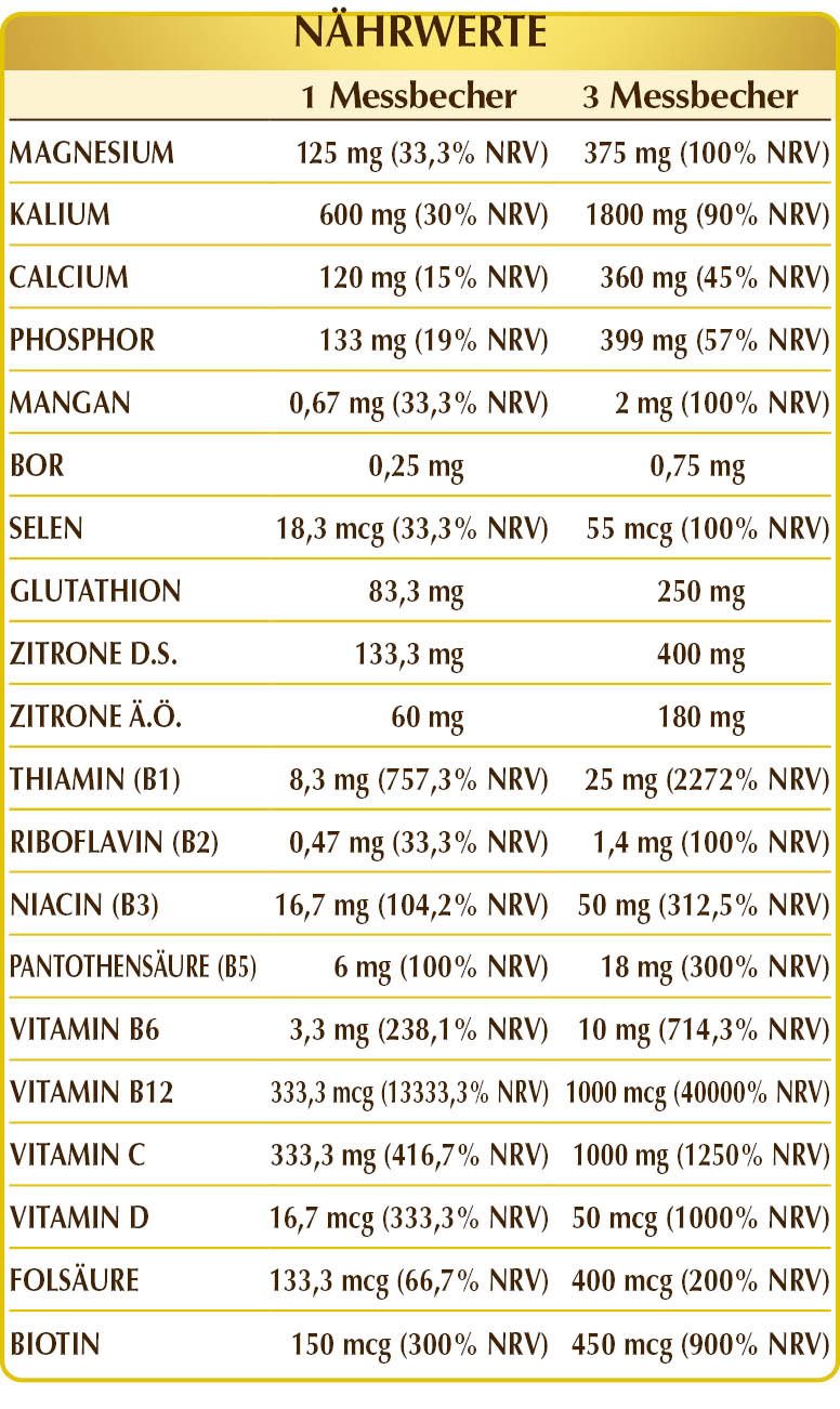 Maltodextrine aus Mais und Reis, Kaliumcitrat, basisches Magnesiumcitrat, Calciumglycerophosphat, Magnesiumglycerophosphat, Vitamin C (Ascorbinsäure), Magnesiumgluconat, Magnesiumpidolat, Kaliumgluconat, Zitrone (Citrus limon) Früchte D.S., reduziertes Glutathion; natürliches Aroma: Zitrone (Citrus limon) Fruchtschalen Ä.Ö.; Vitamin B3 (Nicotinamid), Vitamin B1 (Thiamin-Hydrochlorid), Vitamin B5 (Calciumpantothenat), Flechte (Cladonia rangiferina) Thallus T.E. (standardisiert auf Vitamin D3 Cholecalciferol 100.000 IE / g), Manganesegluconat, aktiviertes Vitamin B6 (Pyridoxal-5-Phosphat); Süßstoffe natürlichen Ursprungs: Steviolglykoside aus Stevia, Thaumatin; Natriumborat, aktiviertes Vitamin B2 (Riboflavin-5-Phosphat-Natrium), aktiviertes Vitamin B12 (5-Desoxyadenosylcobalamin und Methylcobalamin), Biotin, aktivierte Folsäure (L-Methylfolat-Calcium), Natriumselenit. T.E.= Trockenextrakt