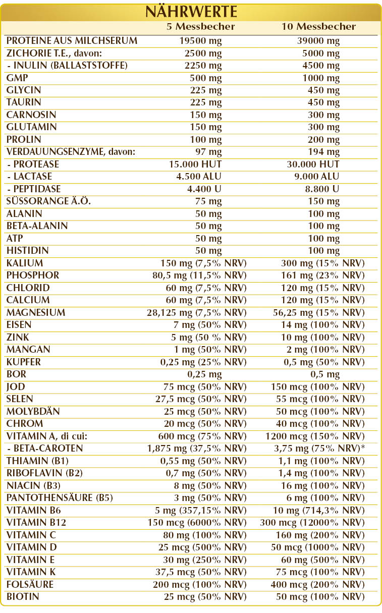 Kalziumkaseinat, Proteine aus Milchserum, Zichorie (Cichorium intybus) Wurzeln T.E. (titriert mit 90 % Inulin), Glutaminpeptid, Calciumglycerophosphat, Magnesiumglycerophosphat, Glycin, Kaliumcitrat, Taurin, (L-)Carnosin, (L-)Glutamin, Kaliumchlorid, (L-)Prolin; Vitamin C (Ascorbinsäure); natürliches Aroma: Süßorange (Citrus aurantium var. sinensis oder dulcis) Fruchtschalen Ä.Ö.; Vitamin E (DL-α-Tocopherylacetat), Eisen-Gluconat, (L-)Alanine, ATP (Adenosintriphosphat-Natriumsalz), Beta-Alanin, (L-)Histidin, Laktase (100.000 ALU/g), Zink-Gluconat, Protease (500.000 HUT/g), Peptidase (200.000 U/g), dunaliella (Dunaliella salina) Thallus (Alge) T.E. (titriert mit 10 % in Beta-Carotin), Vitamin D3 (Colecalciferol 100.000 IE/g), Mangan-Gluconat, Vitamin B3 (Nicotinamid), aktiviertes Vitamin B6 (Pyridoxal-5-phosphat), Vitamin B5 (Calciumpantothenat), Vitamin A (Retinylacetat); Süßungsmittel natürlichen Ursprungs: Steviolglykoside aus Stevia, Thaumatin; Kupfer-Gluconat, aktiviertes Vitamin B2 (Natrium-Riboflavin-5-phosphat), Vitamin B1 (Thiaminhydrochlorid), aktivierte Folsäure (L-Methylfolat-Calcium), Chrom-Picolinat, aktiviertes Vitamin B12 (5-Deoxyadenosylcobalamin, Methylcobalamin), Kaliumiodid, Natriumselenit, Natriummolybdat, Vitamin K1 (Phyllochinon), Biotin.