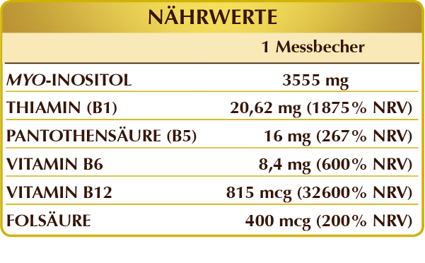 Myo-Inositol pflanzlichen Ursprungs (aus Maissamen gewonnen), Maltodextrin aus Mais oder Reis, Vitamin B1 (Thiaminhydrochlorid), Vitamin B5 (Calciumpantothenat), aktiviertes Vitamin B6 (Pyridoxal-5-phosphat), aktiviertes Vitamin B12 (5-Desoxyadenosylcobalamin, Methylcobalamin), aktivierte Folsäure (Calcium-L-Methylfolat).