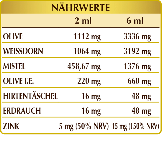 Olive fördert die normale Blutzirkulation, Weißdorn unterstützt die normale Funktionalität des Herz-Kreislauf-Systems, und zusammen sind sie hilfreich, um einen normalen Blutdruck aufrechtzuerhalten. Des Weiteren unterstützt Mistel den Fettstoffwechsel (Triglyceride und Cholesterin).