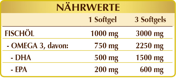 Fischöl (standardisiert auf 75% Gesamt-Omega 3, davon mindestens 50% DHA und 20% EPA); Hilfsstoffe (Softgel): Speisegelatine und Glycerin. Softgels von 1450 mg, davon 1000 mg Nettoprodukt und 450 mg Hilfsstoffe der Hülle.