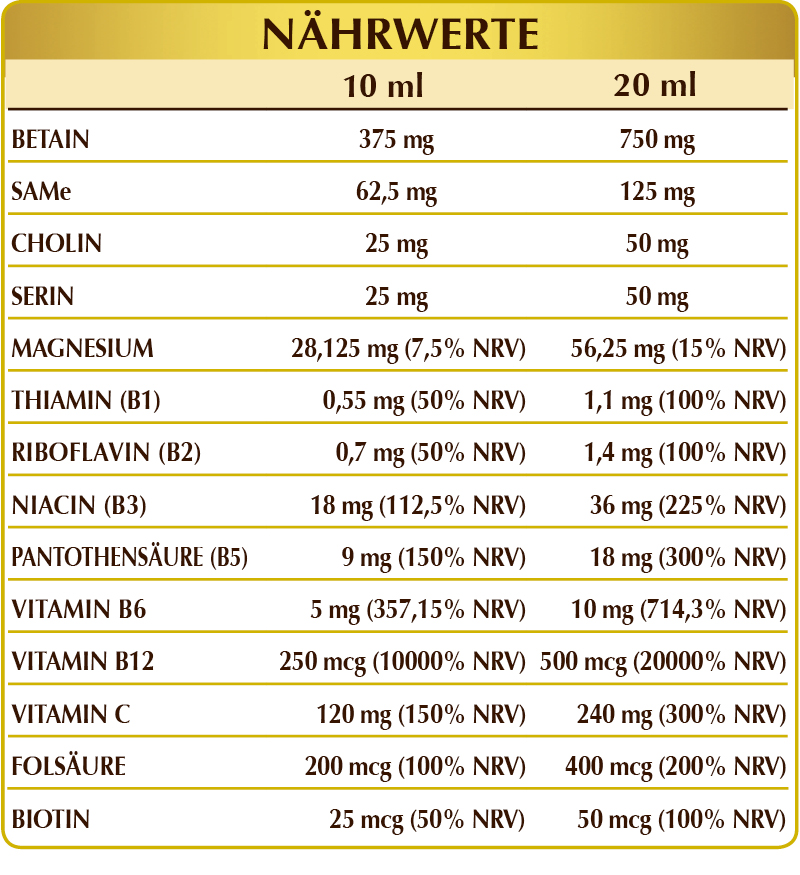 Bidestilliertes pflanzliches Glycerin, reines Wasser, Betain, Magnesiumglycerophosphat, SAMe (S-Adenosylmethionin-Disulfat-Tosylat), Vitamin C (Ascorbinsäure), Cholin-Tartrat, (L-)Serin, Vitamin B3 (Nicotinamid), Vitamin B5 (Calcium-Pantothenat), aktiviertes Vitamin B6 (Pyridoxal-5-phosphat); Süßstoffe natürlichen Ursprungs: Steviolglycoside aus Stevia, Thaumatin; aktiviertes Vitamin B2 (Natrium-Riboflavin-5-phosphat), Vitamin B1 (Thiaminhydrochlorid), aktiviertes Folsäure (Calcium-L-Methylfolat), Biotin, aktiviertes Vitamin B12 (5-Deoxyadenosylcobalamin und Methylcobalamin).