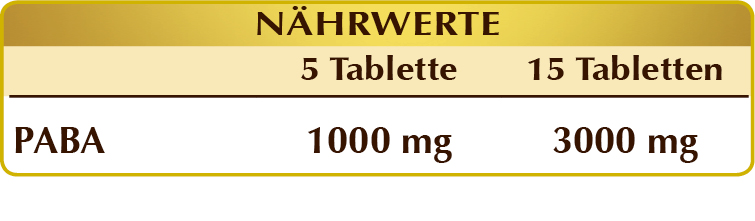 Nahrungsergänzungsmittel auf Grundlage von PABA oder para-Aminobenzoesäure, angezeigt in Fällen in denen man die Zufuhr dieser Nährstoffe in der Ernährung erhöhen will. PABA, auch bekannt als Vitamin H1 oder B10, ist eine nicht essentielle Aminosäure, die an der Synthese von Folsäure beteiligt ist.