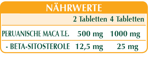 Maca oder Peruanischer Ginseng (Lepidium Meyenii) Wurzeln T.E. (standardisiert auf 2,5% in Beta-Sitosterolen), Maltodextrine aus Mais oder Reis, mikrokristalline Cellulose°, Gummi Arabicum°, Siliciumdioxid°°, Magnesiumstearat pflanzlichen Ursprungs°°.