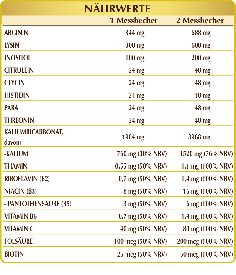 Maltodextrine aus Mais oder Reis, Kaliumbicarbonat, (L-)Arginin, (L-)Lysin HCL oder Hydrochlorid, pflanzliches Myo-Inositol (Extrakt aus Maiskörnern), Kaliumascorbat, (L-)Citrullin, Glycin, (L-)Histidin, PABA (para-Aminobenzoesäure), (L-)Threonin; Süßungsmittel natürlichen Ursprungs: Steviolglykoside aus Stevia, Thaumatin; Vitamin B3 (Nicotinamid), Vitamin B5 (Calciumpantothenat), aktiviertes Vitamin B2 (Natrium-Riboflavin-5-phosphat), aktiviertes Vitamin B6 (Pyridoxal-5-phosphat), Vitamin B1 (Thiaminhydrochlorid), aktivierte Folsäure (L-Methylfolat-Calcium), Biotin.