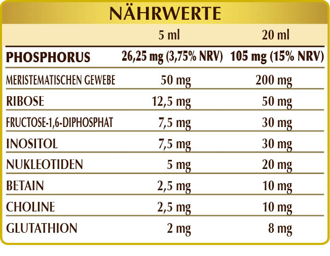 Bidestilliertes pflanzliches Glycerin, reines Wasser, dibasisches Natriumphosphat; acidität Korrektor: phosphorsaeure; glycerinhaltiger Mazerat aus frischen meristematischen Geweben: Birke (Betula alba, Synonyme Betula pubescens, Betula verrucosa oder Betula pendula) Knospen, Schlehdorn (Prunus spinosa) Knospen, Rosmarin (Rosmarinus officinalis) Junge Triebe, Silber-Linde (Tilia tomentosa) Knospen; Ribose, Fructose-1,6-diphosphat, Inositol, Betaincitrat, Cholintartrat; Nukleotid-Mischung: AMP (Adenosinmonophosphat), CMP (Cytosinmonophosphat), GMP (Guanosinmonophosphat), UMP (Uridinmonophosphat); Glutathion, Süßstoffe natürlicher Herkunft: Thaumatin. Mit natürlichen Süßungsmitteln.
