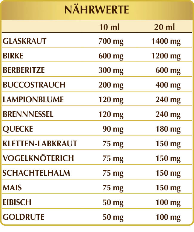 Glaskraut, Weißbirke, Buccostrauch, Brennnessel, Quecke, Kletten-Labkraut, Schachtelhalm, Mais und Goldrute begünstigen die Funktionalität der Harnwege und unterstützen die Drainage der Körperflüssigkeiten. Des Weiteren helfen Glaskraut, Birke, Brennnessel, Kletten-Labkraut und Löffelkraut, die Reinigungsfunktionen des Körpers aufrechtzuerhalten*.