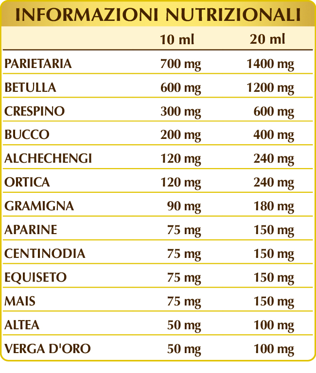Reines Wasser, bidestilliertes pflanzliches Glycerin, Glaskraut (Parietaria officinalis) Kraut F.G.E., Weißbirke(Betula alba oder pubescens) Blätter F.G.E., Berberitze (Berberis vulgaris) Wurzelrinde F.G.E., Buccostrauch (Barosma betulina) Blätter F.G.E., Lampionblume (Physalis alkekengi) Früchte F.G.E., Brennnessel (Urtica dioica) Blätter und Wurzeln F.G.E., Quecke (Agropyron repens) Rhizome F.G.E., Kletten-Labkraut (Galium aparine) Kraut mit Blüten F.G.E., Vogelknöterich (Polygonum aviculare) Kraut F.G.E., Schachtelhalm oder Pferdeschwanz (Equisetum arvense) Kraut F.G.E., Mais oder Zuckerkorn (Zea mays) Stigmata F.G.E., Eibisch (Althaea officinalis) Wurzeln F.G.E., Goldrute (Solidago virgaaurea) Kraut mit Blüten F.G.E., Löffelkraut (Cochlearia officinalis) Kraut mit Blüten F.G.E.; Süßstoffe Natürlicher Herkunft: Steviol-Glykoside und Thaumatin.