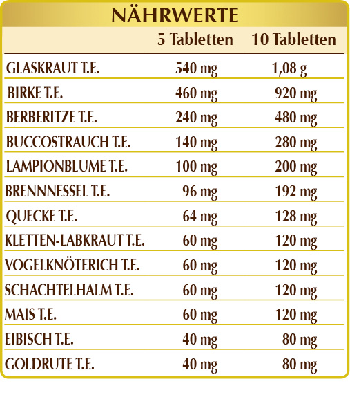 Glaskraut (Parietaria officinalis) Kraut T.E., Birke (Betula alba oder pubescens) Blätter T.E., mikrokristalline Cellulose°, Gummi Arabicum°, Siliciumdioxid°°, Berberitze (Berberis vulgaris) Wurzelrinde T.G.E., Buccostrauch (Barosma betulina) Blätter T.G.E., Lampionblume (Physalis alkekengi) Früchte T.G.E., Brennnessel (Urtica dioica) Blätter und Wurzeln T.G.E., Kletten-Labkraut (Galium aparine) Kraut mit Blüten T.G.E., Vogelknöterich (Polygonum aviculare) Kraut T.G.E., Schachtelhalm oder Pferdeschwanz (Equisetum arvense) Kraut T.G.E., Mais oder Zuckerkorn (Zea mays) Stigmata T.G.E., Eibisch (Althaea officinalis) Wurzeln T.G.E., Goldrute (Solidago virga-aurea) Kraut mit Blüten T.G.E., Magnesiumstearat pflanzlichen Ursprungs.°°