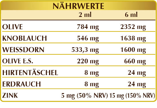 Olive fördert die normale Blutzirkulation, Weißdorn und Knoblauch unterstützen die normale Funktionalität des Herz-Kreislauf-Systems, und zusammen sind sie hilfreich, um einen normalen Blutdruck aufrechtzuerhalten. Des Weiteren unterstützt Knoblauch den Fettstoffwechsel (Triglyceride und Cholesterin).