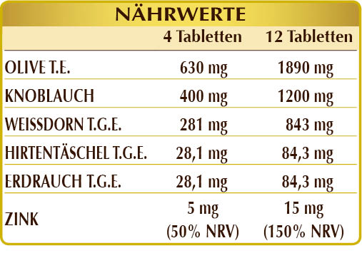 Olive (Olea europaea) Blätter T.E. (standardisiert mit 40% Oleuropein), Knoblauch (Allium sativum) Knollen bei niedriger Temperatur getrocknet (Sulfite) Pulver, Weißdorn (Crataegus oxyacantha) Blüten und Blätter T.G.E., mikrokristalline Cellulose°, Gummi Arabicum°, Zinkgluconat, Hirtentäschel (Capsella bursa-pastoris) Kraut T.G.E., Erdrauch (Fumaria officinalis) Kraut mit Blüten T.G.E., Siliciumdioxid°°, Magnesiumstearat pflanzlichen Ursprungs°°. °Füllstoff °°Trennmittel