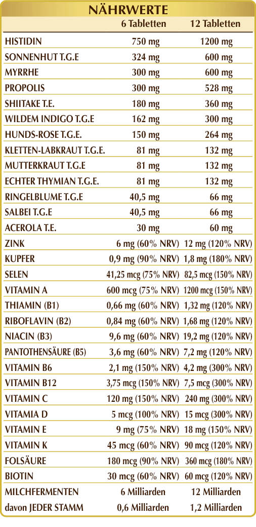 (L-)Histidin, Sonnenhut (Echinacea angustifolia, purpurea und pallida) Wurzeln G.T.E., Myrrhe (Commyphora myrrhaa) Gummiharz Pulv., Propolis (Propolis) Harz Pulv., Shiitake (Lentinus edodes) Sporophor (Pilz) T.E. (tandardisiert auf 30% Polysaccharide), Wildem Indigo (Baptisia tinctoria) Wurzeln G.T.E., Hunds-Rose (Rosa canina) Früchte G.T.E. (standardisiert auf 70 % Vitamin C), Gummi arabicum°, mikrokristalline Cellulose°, Aparinkraut (Galium aparine) Kraut mit Blüten G.T.E., Mutterkraut oder Fieberkraut (Tanacetum parthenium) Kraut mit Blüten G.T.E., echter Thymian (Thymus vulgaris) Blätter G.T.E., Zinkgluconat, Ringelblume (Calendula officinalis) Blütenköpfe G.T.E., Salbei (Salvia officinalis) Blätter G.T.E., Acerola (Malpighia glabra) Früchte T.E. (standardisiert auf 50% Vitamin C), Siliciumdioxid°°, Milchsäuregärgemisch (zu 10% in jedem der folgenden-Stämme titriert: Bifidobacterium bifidum SD5215, breve SD5206, lactis SD5219; Lactobacillus acidophilus SD5212, brevis SD5214, bulgaricus SD5589, casei SD5213, paracasei SD5275, plantarum SD5209, rhamnosus SD5217), Magnesiumstearat pflanzlichen Ursprungs°°, Vitamin E natürlicher Herkunft (D-α-Tocopherylacetat), Vitamin B3 (Niacin), Vitamin A (Retinylacetat), Vitamin B5 (Calciumpantothenat), Kupfersulfat, Flechte (Cladonia rangiferina) Thallus T.E. (standardisiert auf Vitamin D3 Cholecalciferol 100.000 IE/g), Vitamin B6 (Pyridoxin), Vitamin B1 (Thiamin), Vitamin B2 (Riboflavin), Chrompicolinat, Folsäure, Kaliumiodid, Natriummolybdat, Natriumselenit, Vitamin K1 ( Phyllochinon), Biotin, Vitamin B12 (Cyanocobalamin). Pulv. = Pulver °Füllstoff °°Trennmittel