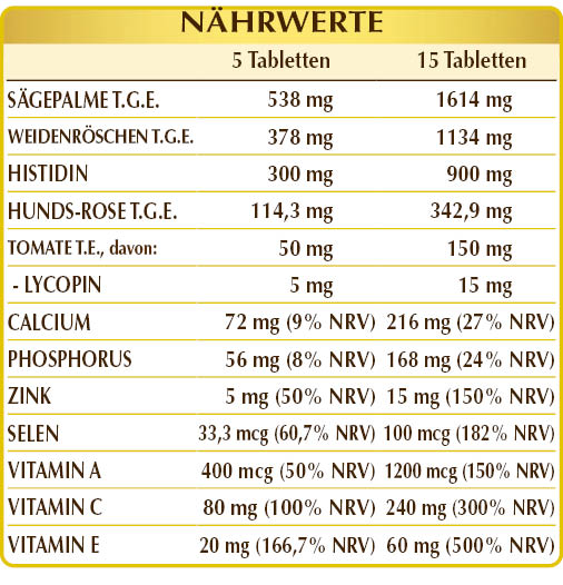 Sägepalme oder Saw Palmetto (Serenoa repens oder Sabal serrulata) Früchte G.T.E., Epilobium (Epilobium parviflorum) Kraut G.T.E., Gummi Arabicum°, mikrokristalline Cellulose°, Calciumsalze des Phosphors (Calciumphosphat), (L-)Histidin, Hagebutte (Rosa canina) Früchte G.T.E. (standardisiert auf 70% Vitamin C), Siliciumdioxid°°,Tomate (Solanum lycopersicum) Früchte T.E. (standardisiert auf 10 % Lycopin), magnesiumstearat pflanzlichen Ursprungs°°, pflanzliches Vitamin E (D-α-Tocopherolacetat), Zinkgluconat, Vitamin A (Retinylacetat), Natriumselenit. °Füllstoff °°Trennmittel